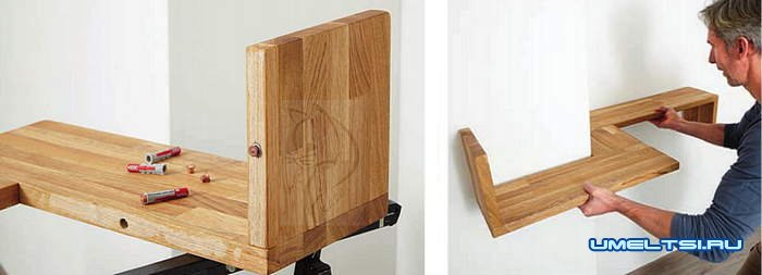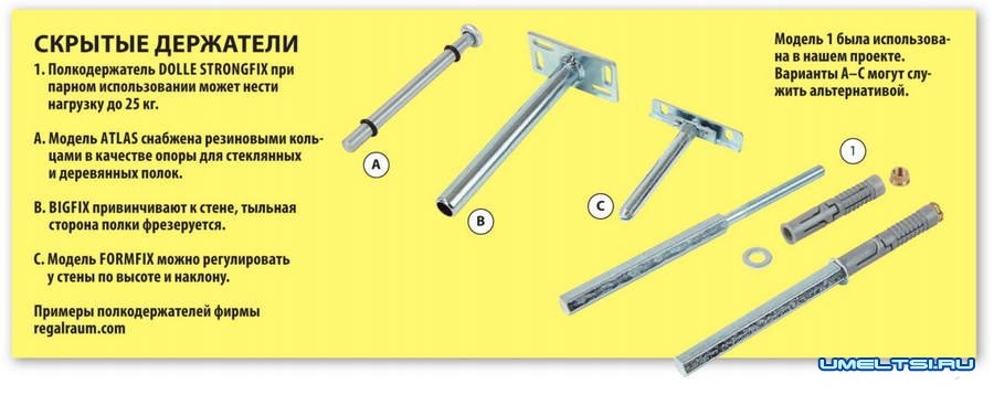Особенность изогнутой полки заключается в скрытом креплении. Для него вам потребуются так называемые скрытые держатели и, прежде всего, точность при просверливании отверстий в деталях полки и в стене.