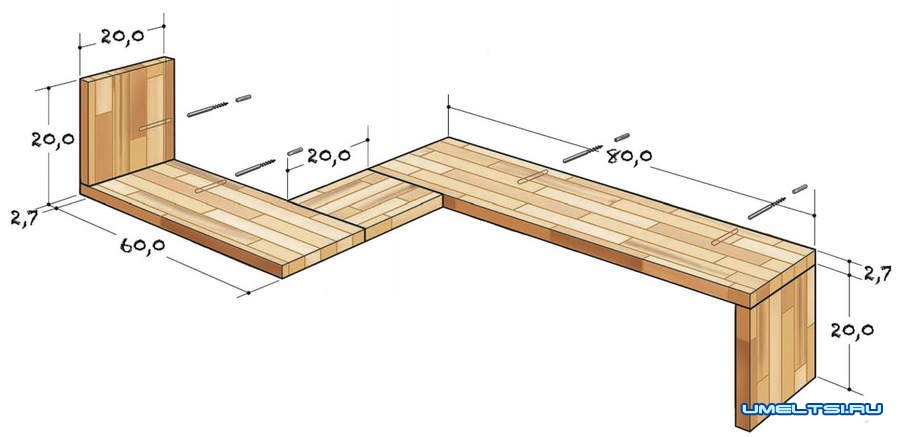 Форму огибающей угол полки определяет, разумеется, сам угол. В качестве материала следует использовать массивные доски из клееной древесины.
