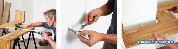 11. Надеть угловую полку на скрытые держатели. Завершить работу поможет молоток с подложкой.