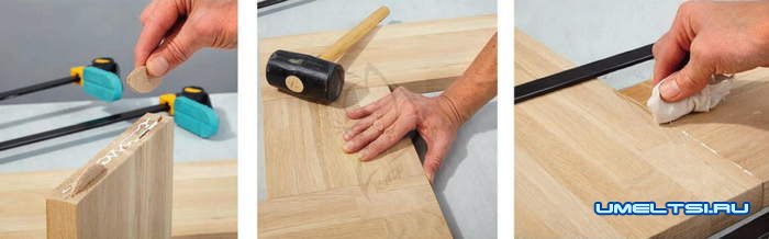8. При установке струбцин клей О выступит из пазов. Это обеспечит стыкам водонепроницаемость. Лишний клей стереть.