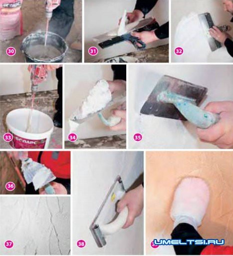 Маленьким шпателем накладываем готовый раствор на большой шпатель (31) и наносим на стену слоем от 0,2 до 3 мм (32), учитывая, что шпатлевка находится в рабочем состоянии не менее 2 ч. Вновь обрабатываем поверхность грунтом «Боларс Укрепляющий». Для получения рельефа берем декоративную штукатурку «Боларс Malta». Перемешиваем ее дрелью со специальной насадкой (33). Маленьким шпателем накладываем порцию материала на кельму (34) и наносим на стену произвольными мазками (35). Излишки материала снимаем (36) и заново распределяем по поверхности, получая фактуру, похожую на песчаные барханы или наплывы каменной породы (37). Работаем последовательно, участками примерно по 1 м2, не останавливаясь, «от стены до стены».
