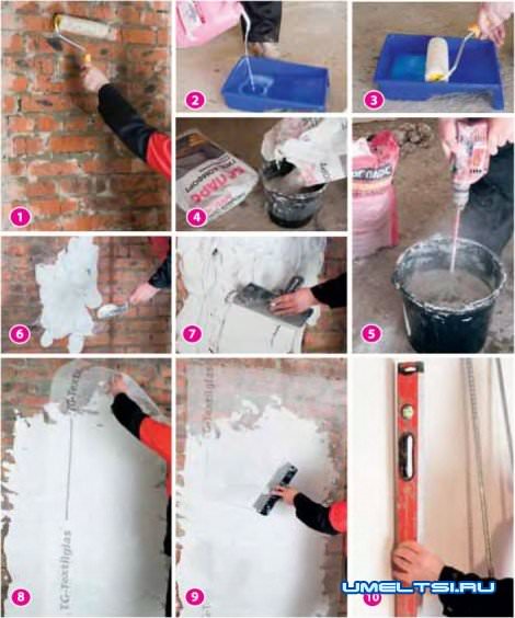 Примерно через сутки снова грунтуем поверхность грунтом «Боларс Глубокого проникновения». Затем оцениваем ее отклонение от вертикали с помощью уровня (10).Подготовительным этапом для выравнивания служит установка маяков — они помогут нам сделать стену идеально вертикальной.