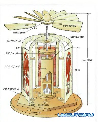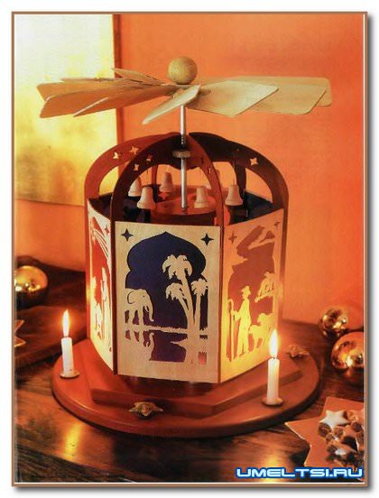 Наш журнал предлагает интересную идею - самодельный домик-карусель с подсветкой. Он выделяется своей оригинальностью на фоне всего этого стандартного многообразия. Его даже можно назвать произведением искусства, сделанным своими руками. Лобзиком выпиливаются силуэты, украшающие домик. А для придания ему изысканности мы использовали хорошо известные всем кальку и обычные свечи. Короче говоря, наш вариант создания праздничного настроения в этом году выглядит роскошно и оригинально, а расходы на его изготовление не особо ударят по карману.Следует отметить, что лопасти карусели вращаются за счет восходящих потоков теплого воздуха, поднимающегося от шести небольших свечей, размещенных внутри, и еще от шести - от размещенных снаружи. Для того чтобы поменять свечи внутри, необходимо просто приподнять каркас.