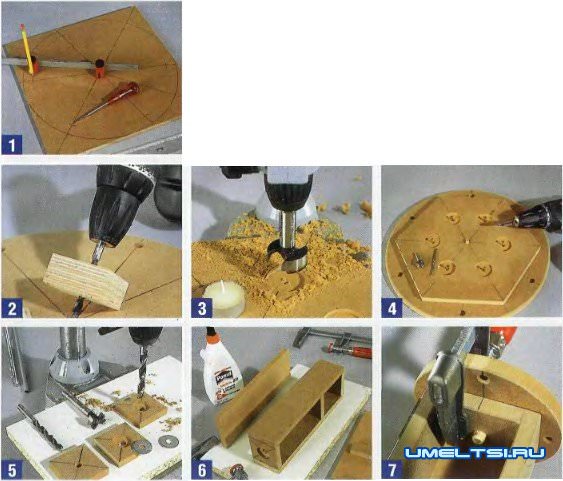 З. Просверлите в шестиугольной подставке глухие отверстия для свечей глубиной 3-4 мм.