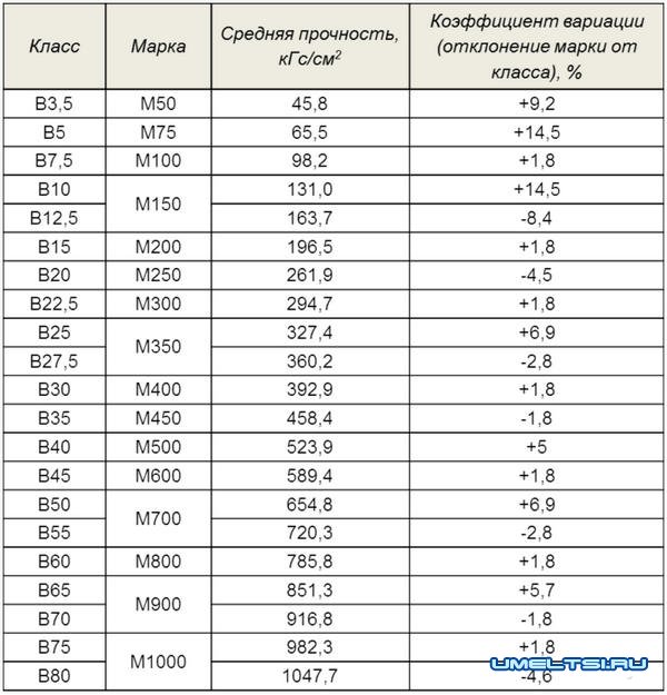 Отношение класса и марки с выделением среднего показателя прочности бетона указано в таблице (в соответствии с ГОСТ 26633-91).