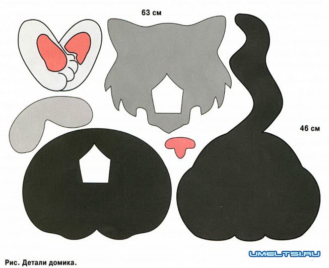С остальными деталями было проще. Глубина домика у меня составляет 20 см. Исходя из этого, я вырезал из того же мебельного щита основание шириной 22 см и верхнюю перемычку шириной 5 см. Приклеил их к боковинам, укрепив соединение шкантами ⌀ 8 мм. Бока «туловища кота» зашил рейками внахлёст.