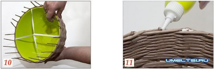 Крышку плетем на форме подходящего размера (у меня — пластиковая миска). Аналогично подносу плетем донышко. Затем привязываем его к форме бельевой резинкой (фото 9, 10). Оплетаем миску до нужной высоты и отвязываем заготовку. Стоячки обрезаем максимально близко к основе. Каждую обрезанную трубочку фиксируем;прокапывая клеем ПВА(фото 11) Приплетаем на крышке ручку.