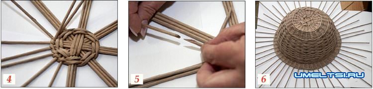 Чтобы начать плести донышко, раскладываем стояки по 3 шт. в виде восьмиконечной звезды, фиксируя центр клеем. Затем складываем одну трубочку пополам, надеваем ее на группу стоячков и, перекрещивая концы, оплетаем серединку (фото 3), плотно располагая витки друг к другу. Через 2-3 ряда разделяем стоячки по одному и оплетаем их раздельно (фото 4), вплетая дополнительные стойки по необходимости.
