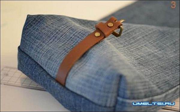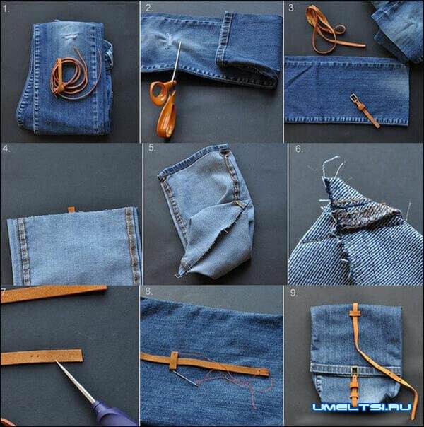 • Берем иголку с ниткой и пришиваем ремешок к сумки от верха до низу. Затем вывернем штанину наизнанку. Рис4.