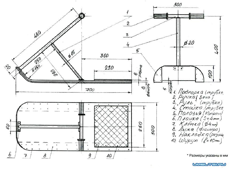 Из трубы и металлических полосок сварил рулевую стойку и закрепил ее на лыже заклепками.