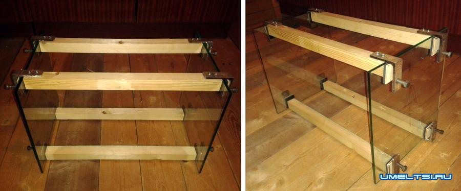 Теперь смотрим для какой задачи это делается. Стекла, которые будут стоять по бокам, мы зажимаем этим приспособлением. То, что бруски имеют одинаковую длину, обеспечивает параллельное расположение стекол. Правда, нужно было чуть повозиться, дабы получить прямые углы между кромками стекол. Для этого я замерил диагонали и воспользовался угольником.