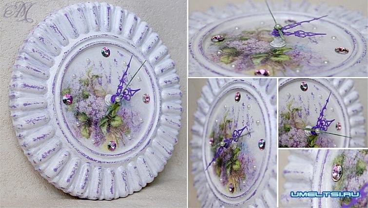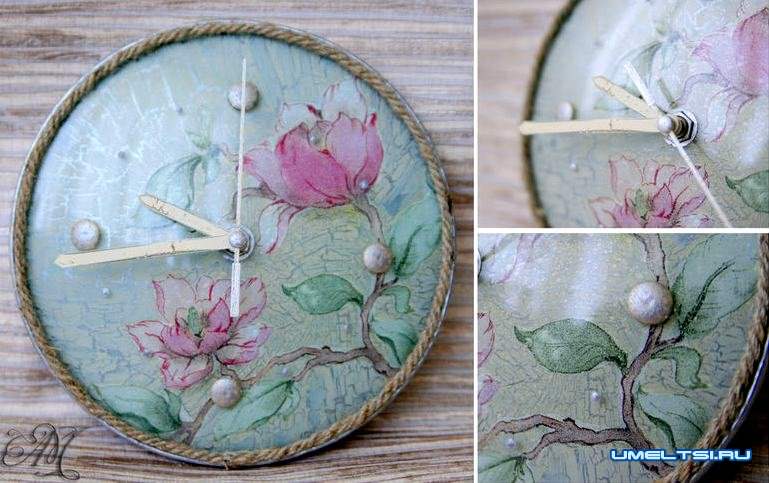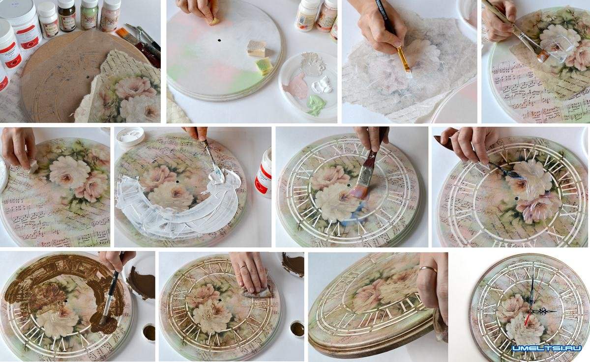 Для создания часов в этом стиле рекомендуется в качестве основы часов использовать дерево, поскольку на такую поверхность декоративные элементы очень хорошо наклеиваются.