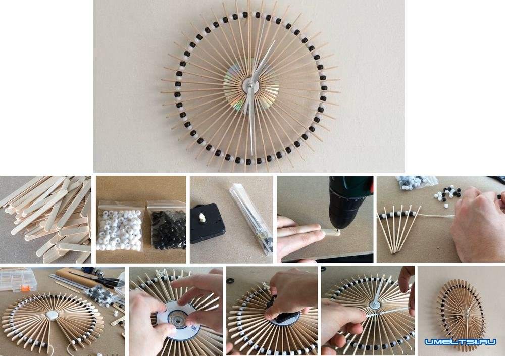 В этом случае для декорирования часов нужно подготовить качественные палочки из дерева, клей, ножницы, и основу в виде готовых рабочих часов с плоским циферблатом.