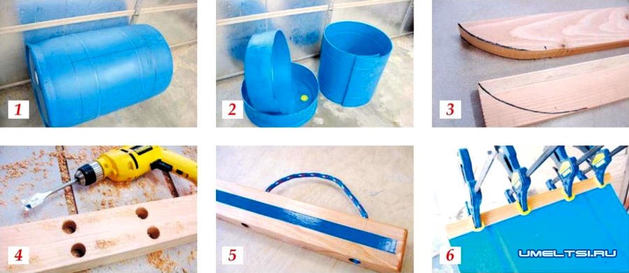 1. Вначале Алексей разметил бочку маркером (фото 1) Затем по линиям разрезал ее (фото 2) — отпилил электролобзиком верхнюю часть и дно, средний цилиндр распилил так, чтобы получилась широкая полоса — основа санок.