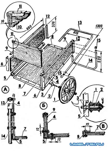 Благодаря велосипедным колесам у нее лучшая, по сравнению с тачкой, проходимость, а съемная стенка делает ее самосвальной при разгрузке сыпучих материалов — песка, перегноя, земли.