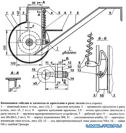 Чтобы трос сматывался равномерно и не запутывался, в конструкции лебедки предусмотрено простейшее устройство притормаживания катушки. Оно состоит из гнутой стальной папы и пружины растяжения. Лапа наасажена на осьшпильку, приваренную к правому кронштейну крепления лебедки со стороны подшипника, а пружина надета на ушко лапы и на резьбовой крючок, ввернутый в заднюю тюлку крепления двигателя.