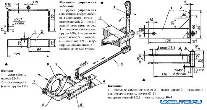 Лебедка приводится в действие от двигателя трактора с помощью механизма отбора мощности (МОМ), установленного на коробке передач (на тягаче она — от автомобиля ГАЗ-51). Этот механизм, выдвигавший когда-то большую антенну на мобильной радиостанции, имеет рычаг управления с тремя положениями: «вперед», «стоп» и «назад». Первое не используется, поскольку при «стоп» и выключенной лебедке трос можно легко размотать и вручную. Это делает второй оператор, откатывая плуг на встроенном в него колесе к началу новой борозды. Заняв там исходную позицию, он подает знак первому оператору Тот включает лебедку и переводит рычаг механизма отбора мощноети в положение «назад». Катушка начинает вращаться, наматывая трос, и плуг, управляемый вторым оператором, вгрызается в землю.