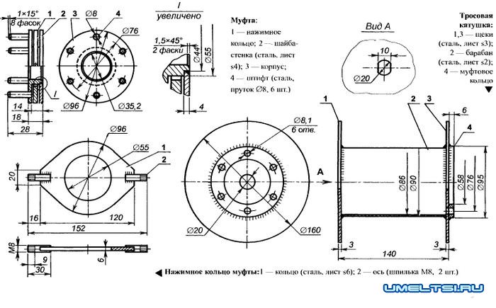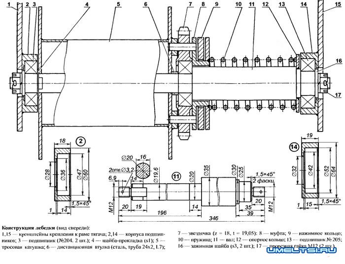 Сама лебедка состоит из нескольких довольно простых узлов и деталей. В основе ее — вращающийся в двух подшипниках ступенчатый вал. на который насажены катушка с тросом, звездочка на своем подшипнике, штифтовая муфта и пружина сжатия.