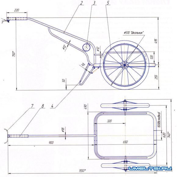Потом приготовил и приварил по продольной оси симметрии прицепа ручку-дышло (изогнутое), выдержав высоту ручки 750 мм от земли при параллельном земле положении кузова.