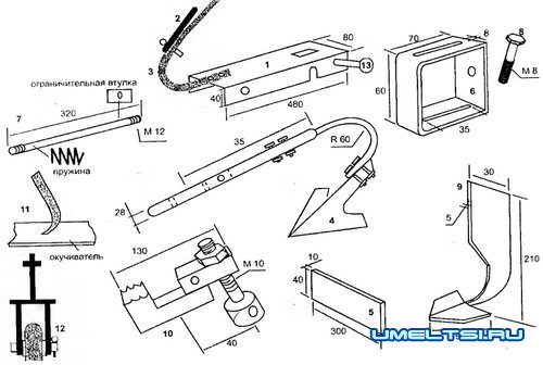 Если культиватором управляет подросток, следует укоротить основную ручку руля управления 3. Она сделана из двух труб разного диаметра - одна Для окучивания растений с культиватора можно снять лапы и установит окучник 11, а для пахоты закрепить на раме плуг. Сам плужок регулируется (его можно превратить в боро-знувальник или окучник), благодаря шарнирно соединению он может складываться и раздвигаться.