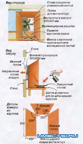 А теперь о том, как самому изготовить покрасочною камеру своими руками. Для нее сначала надо купить трехскоростной вентилятор в корпусе 500x500 мм и вентиляционную решетку Затем по размерам, приведенным на рис., из картона вырезают боковые стенки и крышку камеры. Их склеивают липкой упаковочной лентой. Потом ставят собранный кожух вертикально и к его внутренней стороне изоляционной лентой (для облегчения замены) крепят решетку.