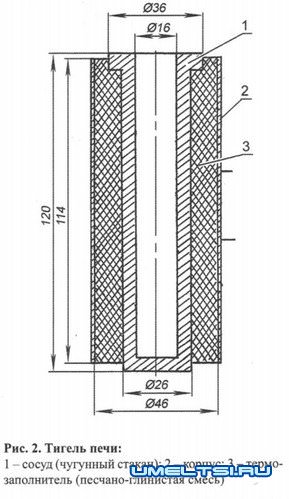 Внутри металлического кожуха цилиндрической формы 2 (см. рис,2) помещается стакан 1, изготовленный из металла, температура плавления которого выше, чем у расплавляемого металла.