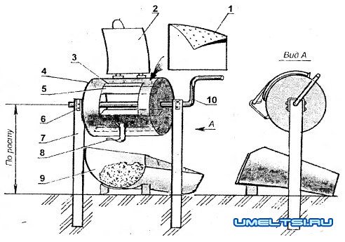 1 - накладной уплотнитель крышки (резиновый коврик 500x500 мм); 2 - крышка люке с ручкой-скобой (на виде А крышка закрыта); 3 - люк; 4 - бочка (на 60 л); 5 -лопасть (по всей длине бочки, 3 шт., h = 100); 6 - хомут оси (2 шт.), 7 - опора (2 шт., деревянный столб d 100... 150. /г = 1500); 8 - крючок к ручке-скобе. 9 - лоток под раствор; 10 - ворот-ось (труба 3/4").