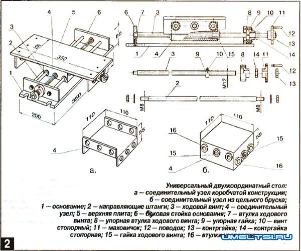 Центральный соединительный узел можно согнуть из металлического листа толщиной 3-4 мм (см. рис. 2а) или сделать из цельного бруска (рис. 2б). В крайнем случае, его можно сделать даже из бруска твердой древесины, а латунные втулки 16 для направляющих штанг и гайки 15 ходовых винтов вклеить эпоксидным клеем.
