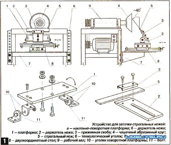 Держатель 2 представляет собой прочную стальную пластину толщиной не менее 5 мм с продольным пазом под винты крепления его к поворотной платформе. Продольный паз необходим для настройки и регулировки устройства во время установки необходимого угла заточки. На одном конце держателя 2 имеется уступ, к которому затачиваемый нож 5 поджимается скобой 3 с помощью двух болтов.