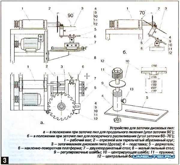 Это же устройство можно использовать для заточки дисковых пил и фрез. Причем доработать и изменить необходимо только держатель затачиваемого инструмента (рис. 3). Все остальные элементы конструкции универсального заточного устройства остаются неизменными.