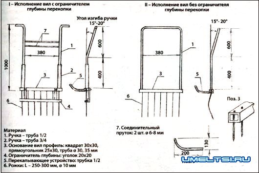 Начал с упрощения конструкции. Во-первых, никакого ограничителя глубины обработки - это усложняет изделие, да и рычаг упора пришлось бы перемещать. При желании можно сделать вилы с короткими зубьями. Для облегчения пришлось отказаться от использования водопроводных труб в качестве каркаса. Применил тонкостенный квадратный профиль. Зубья сделал тоже чуть тоньше 10 мм, семь штук. Размеры выдержал примерно такие, как на чертеже - получилось как раз по росту. Можно было бы сделать еще легче, если сваривать каркас на месте, но мне пришлось изготовить разборную конструкцию на болтах. Дело в том, что участок расположен теперь в 100 км от места моего проживания. Для удобства перевозки подошел разборный вариант, сделал что бы легко и удобно было складать и разбирать.