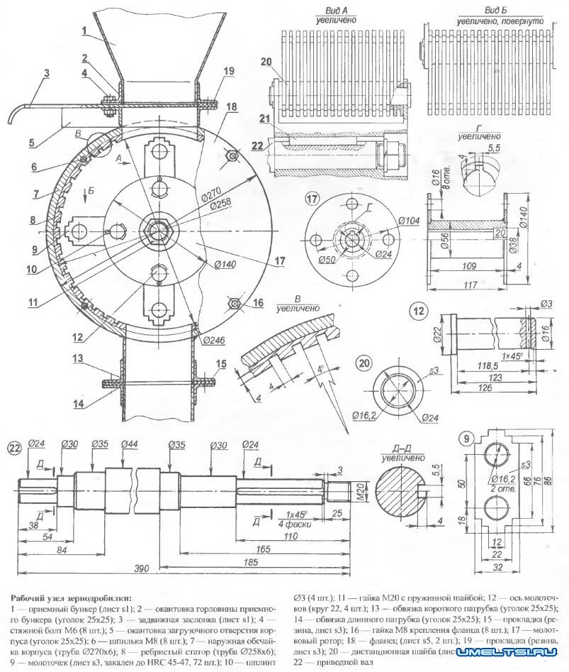Наиболее важный и сложный узел в зернодробилке-измельчителе — молотковый ротор. Его изобретать заново я не стал и сделал по образцу и подобию тех, что стоят в аналогичных, выпускаемых серийно машинах, уменьшив только длину молоточков (чтобы они уместились в корпусе), но увеличив их количество на оси.