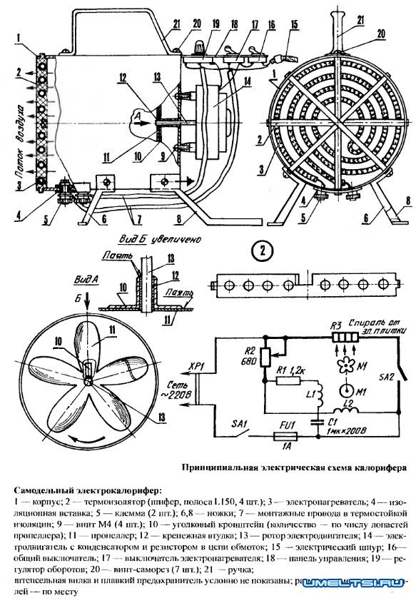 Как и в большинстве промышленных аналогов, поток воздуха в этом калорифере создает самодельный многолопастный пропеллер. Жестко зафиксированный на валу электродвигателя, он прогоняет воздух через раскаленную них-ромовую спираль, закрепленную на распорках из жаропрочного электроизолирующего материала. Это в режиме обогрева помещения или просушивания одежды. При выключенном нагревателе самодельный МЭК работает как обычный вентилятор.