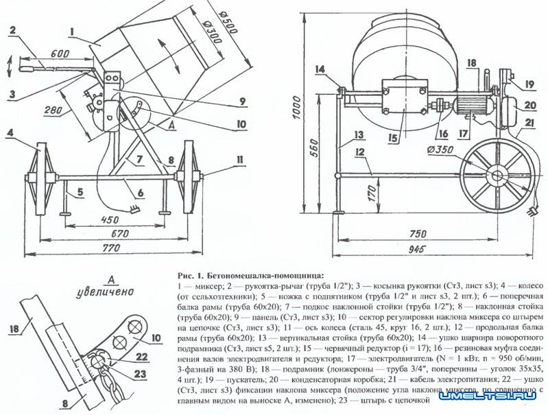 Вообще-то говоря, бетономешалка сконструирована под правшу среднего роста. Если же хозяин-оператор левша, то конструкцию надо делать в зеркально отображенном варианте, а при высоком его росте следует увеличить сантиметров на 10 и высоту стоек рамы.
