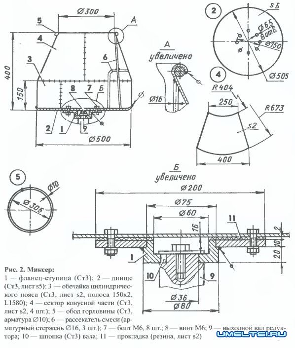 Изготовление бетономешалки начал со смесителя — бочонка-миксера. Первым делом вырезал заготовки: из стального листа толщиной 5 мм — днище, из 2-мм листа — цельную обечайку цилиндрического пояса и несколько «лепестков»-секторов для конусной части (хотя обечайку тоже вполне можно сделать составной). Далее заготовкам с помощью молотка и тисков придал нужные радиусы и изгибы. Затем начал их сборку. К днищу прихватил пояс, а к поясу — лепестки (последние еще и соединил между собой). Образовавшуюся горловину окаймил ободком из 10-мм арматуры и края завальцевал вокруг него. После этого все швы тщательно проварил электродуговой сваркой. Внутри миксера для принудительного перемешивания смеси приварил еще три рассекателя. Их сделал из 16-мм арматурных стержней