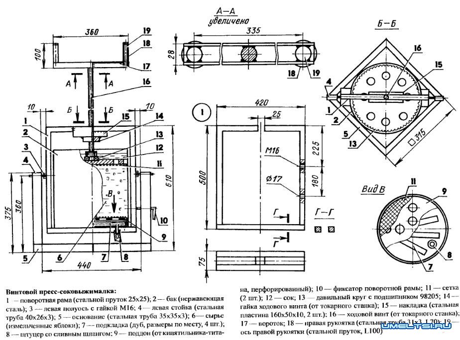 Конструкция пресса - соковыжималки: чертежи