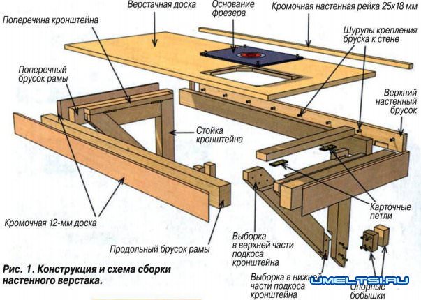 Рабочая поверхность верстака размерами 1300x600 мм позволяет обрабатывать большеразмерные детали, а рамная конструкция столешницы, обладая значительной прочностью и устойчивостью, хорошо выдерживает и ударные нагрузки. Конструкция верстака состоит из откидной столешницы (рамы с верстачной доской), поворотных опорных кронштейнов, прикреплённых на петлях к брускам рамы, и двух настенных брусков. К верхнему бруску прикреплена на петлях рама верстачной доски, нижний брусок является опорой для пяток кронштейнов. Конструкция и схема сборки верстака показаны на рис. 1.