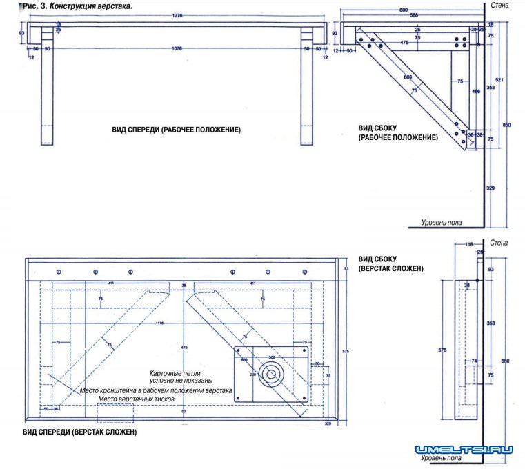 В его конструкции настенного верстака опорные кронштейны — поворотные, а верстачная доска — откидная, поэтому в сложенном положении верстак занимает очень мало места.