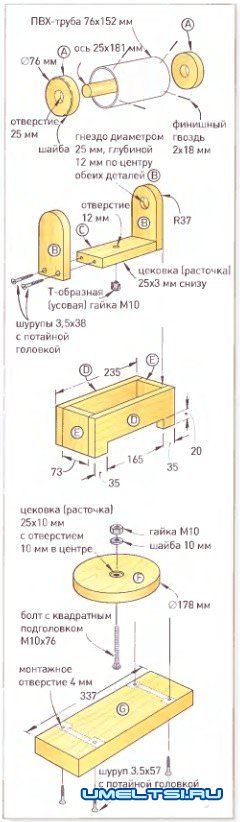 Выполняя работу на портативном станке, установленном на верстаке, сложно удерживать длинные детали при обработке. Предлагаемое приспособление поможет обойти подобные трудности. Устойчивая опора отлично поддерживает заготовки, а высота ролика из ПВХ тонко регулируется в диапазоне 25 мм поворотом диска F. Сначала выпилите деревянные шайбы А и вклейте их зпоксидным клеем в ролик из ПВХ-трубы.
