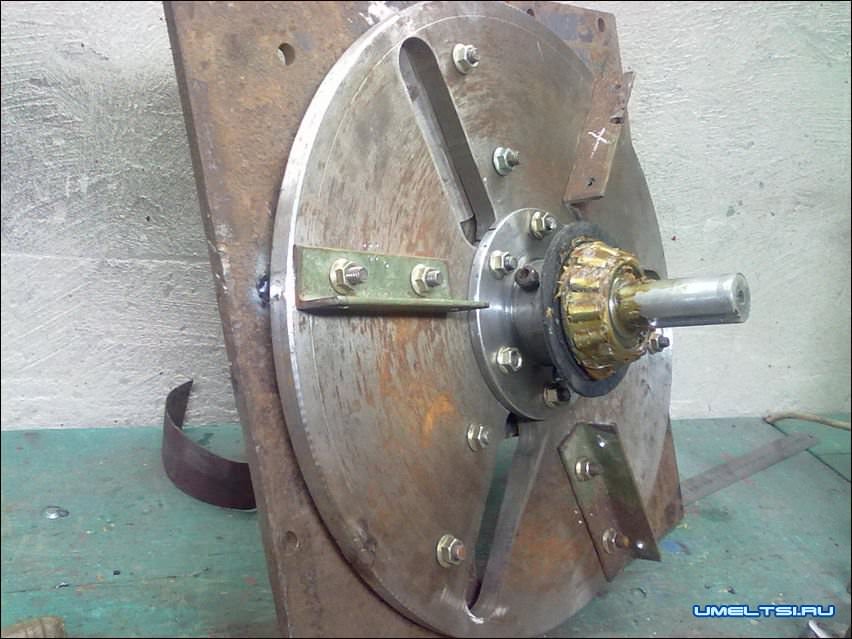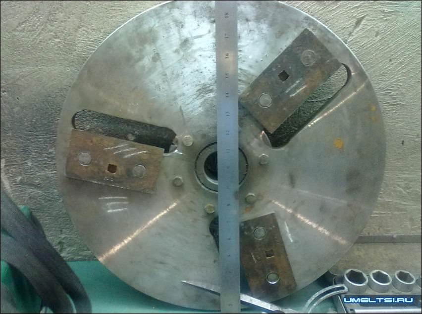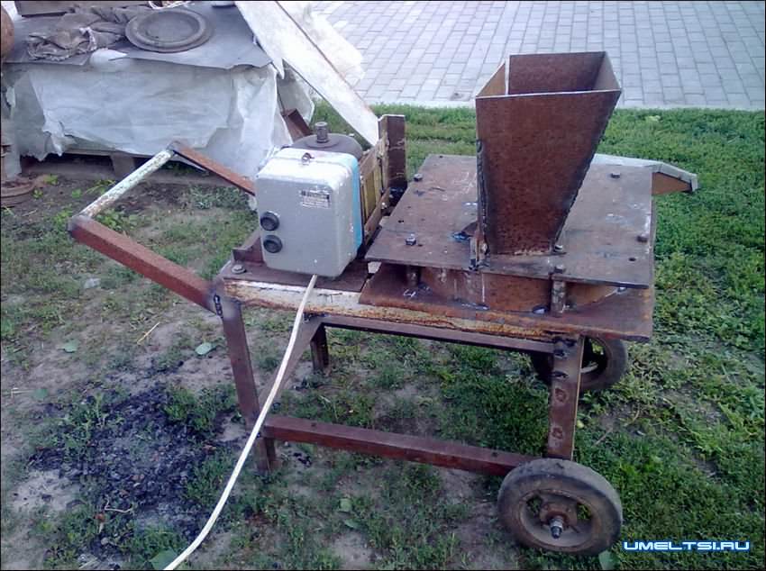 Можно сделать садовый измельчитель с электродвигателем, тогда и возни с измельчением будет меньше, но должно быть место для подключения, что проблематично в разных местах участка. В принципе, он нисколько не отличается от вышеописанного. Для такого измельчителя потребуется диск диаметром 20 миллиметров с тремя овальными отверстиями для последующего крепления ножек. Оптимальным будет двигатель в 3 кВт, но можно взять и помощнее. Диск можно разместить горизонтально, по желанию, можно установить и вертикально. Его еще называют измельчитель щепы.