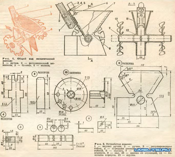 Устроена она просто. Корпус служит бункером для семян, а вал, вращаемый колесами при движении, — дозатором. Семена, попадая в неглубокие выемки на поверхности вала, проходят под передней стенкой бункера и поочередно падают в землю. Количество семян в одной порции регулируется подвижной щеткой на передней стенке.