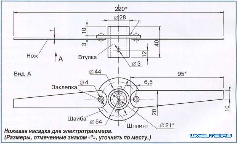 Ходить по магазинам в поисках запасных деталей — дело неблагодарное, и от этой мысли я отказался сразу. Какой смысл зря терять время и деньги, если новая деталь прослужит ничуть не дольше прежней, а лишь до первой встречи с какой-нибудь железякой, притаившейся в траве. Лучше уж сразу заменить сломанную катушку самодельной насадкой с ножами-лепестками из нержавеющей стали (см. фото).