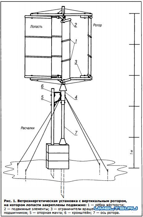 Каркасом для лопастей ротора, обтянутых тканью, служат подвижные элементы 2 крестовины ротора и рёбра жёсткости 1. Ограничители вращения 3 лопастей крепят к крестовине ротора неподвижно. Блок подшипников 4 установлен на опорной мачте 5 при помощи кронштейна 6 из стальной полосы. Опорная мачта обеспечивает оси ротора 7 дополнительную жёсткость.