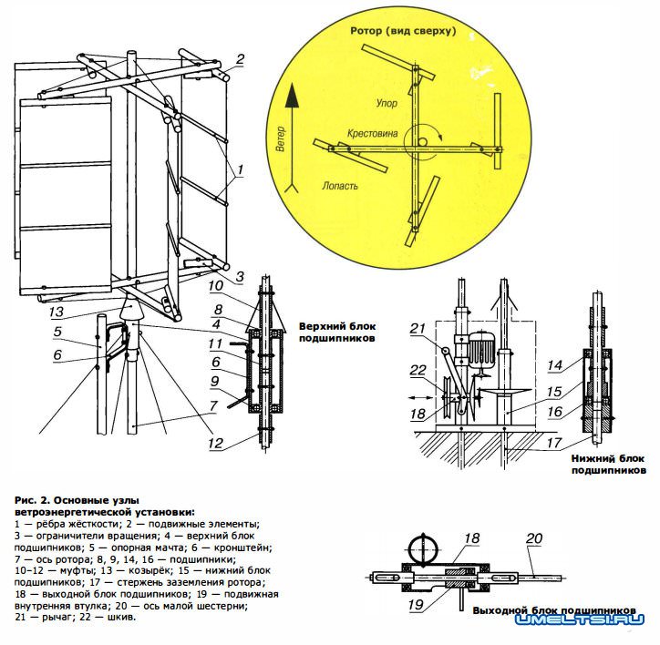 Расчалки, прикрепленные к блоку, фиксируют строго вертикальное положение оси ротора, обеспечивая необходимую жесткость всему сооружению. Жестяной козырёк 13 предохраняет от попадания влаги в подшипники блока.