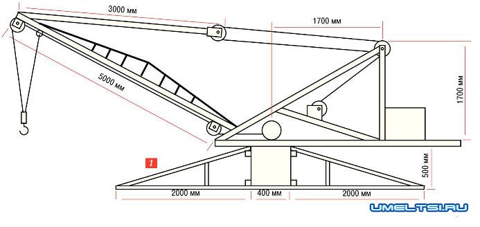 В качестве стрелы была использована пятиметровая труба диаметром в 50 миллиметров, также, особенность конструкции подразумевает под собой, что в будущем стрелу возможно будет удлинить на несколько метров. Усиливается подобная конструкция металлическими уголками 30х30х3.