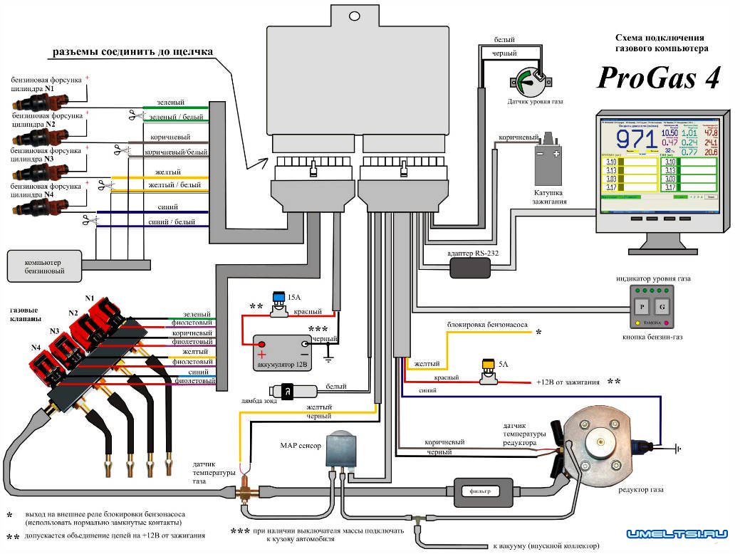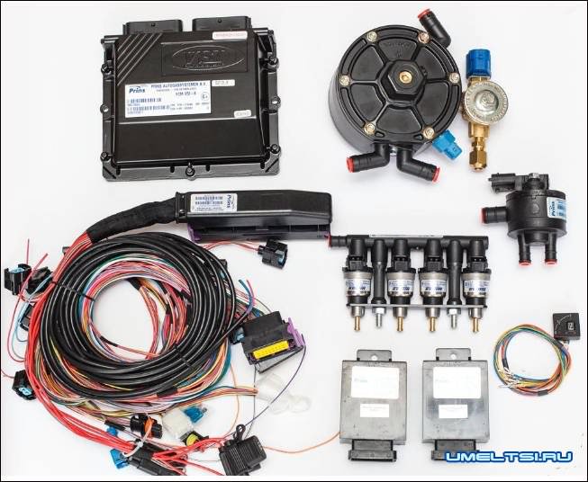 1. Комплект ГБО. Выбор комплекта напрямую зависит от марки автомобиля. Основной набор состоит из проводов, компьютера, жгутов, шлангов, клапанов, форсунок, датчиков температуры газа, давления и редуктора. В некоторых случаях комплектация может отличаться.