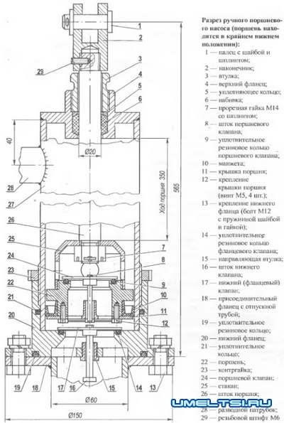 Устройство центробежного электрического насоса описывать нет необходимости — он заводского изготовления и Устройство ручного насоса понятно из чертежа, на котором представлен его разрез. Изображения всех сборочных единиц выполнены в масштабе по отношению друг к другу и привязаны к внутреннему диаметру корпуса. Конструкция насоса, в общем-то, тривиальная. По сравнению с подобными механизмами, немного усложнен поршневой узел, но это окупается значительным разрежением внутри системы и высоким кпд. Этим насосом возможен подъем воды с глубины до 10 м.