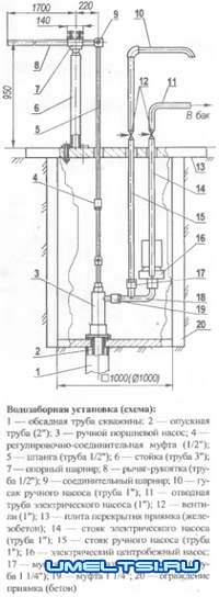 Особенность конструкции установки состоит еще и в том, что наиболее сложные (а значит, и ценные) механизмы — насосы, как ручной, так и электрический, смонтированы в достаточно глубоком, закрытом железобетонной плитой, бетонном приямке, труднодоступном при несанкционированном доступе в него. Это немаловажно в дачно-садовом хозяйстве, которое зачастую остается на длительное время без надзора. Утепление приямка при такой его глубине обеспечивает незамерзание воды и круглогодичную эксплуатацию установки.