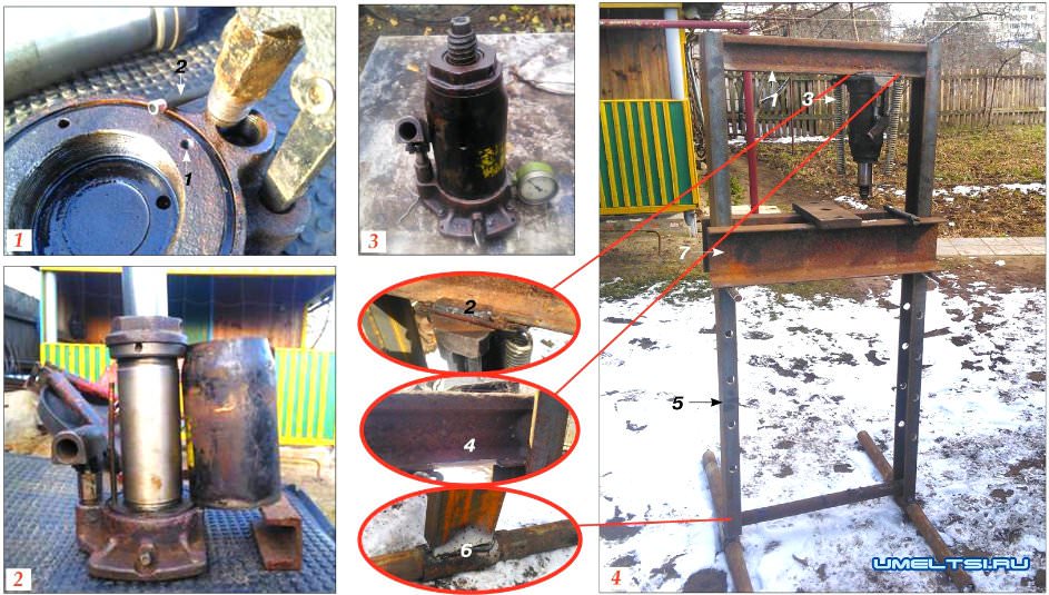 Для верхней перекладины (фото 4, п. 1), к которой будет крепиться механизм (домкрат), приспособил кусок рельсы длиной 1 м (можно короче). Для фиксации к упору домкрата, в подошве последнего, просверлил отверстия d 6 мм для крепления направляющих (2). которые сварил из двух пластин подходящего размера. Также в основании просверлил отверстия для крепления пружин (3), которые нужны для возврата поршня в исходное положение.