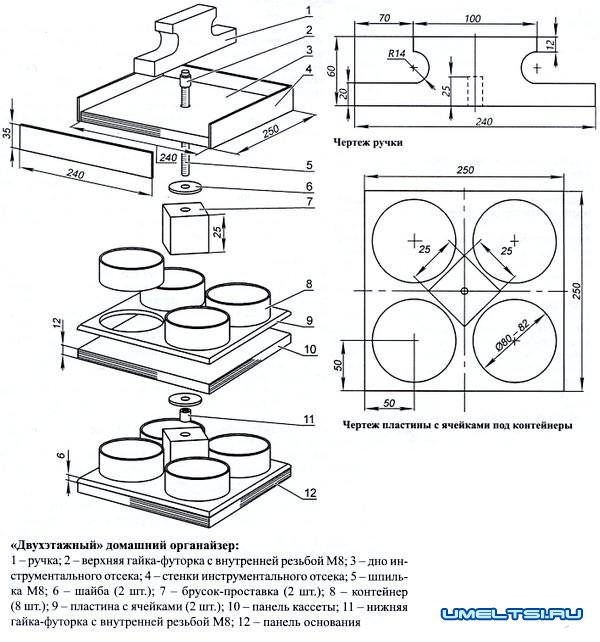 Верхний отсек разделен на два лотка, а его перегородка служит ручкой для переноски органайзера. Вкручиваем снизу в ее тело еще одну футорку на М8 (либо сверлим насквозь и запрессовываем гайку сверху, как в нижней части) и определяем окончательную длину шпильки. Она должна быть такой, чтобы чуть повернув ручку (немного отпустив верхнюю гайку), кассетницы разных уровней можно было вращать, выбирая нужный крепеж. А затянупи ее - органайзер превратился в аккуратный и компактный «столбик», примостившийся в углу рабочего стола.